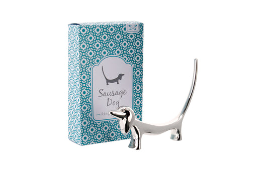 Sausage Dog Metal Silver Finish Ring and Jewellery Holder and Organiser Stand in Gift Box | Bedside and Bathroom or Kitchen Sink Storage
