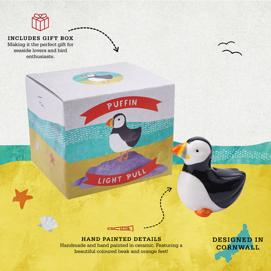 Puffin Ceramic Light Pull Handle | In Gift Box | Decorative Bathroom Cord Pull | Unique Nautical Theme Lighting Accessory | Home Improvments