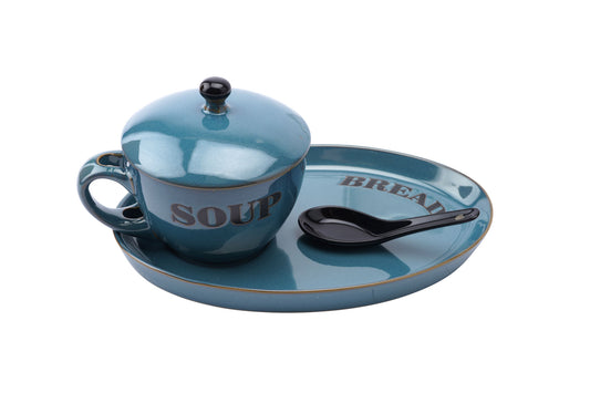 Blue Ceramic Soup Bowl with Bread Plate and Spoon in Gift Box | Country Kitchen Chic | Rustic | Breakfast Lunch Dinner