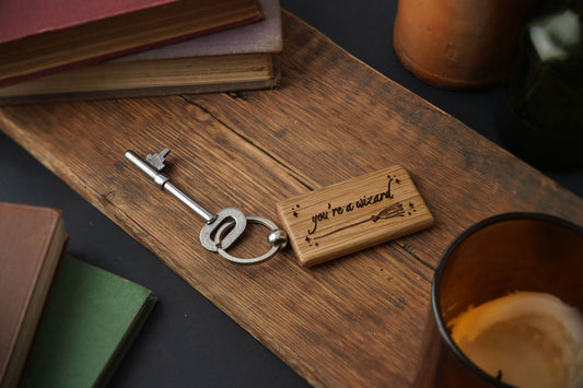 Personalised Rectangular Oak Keyring 'You're A Wizard' With Broomstick Illustration