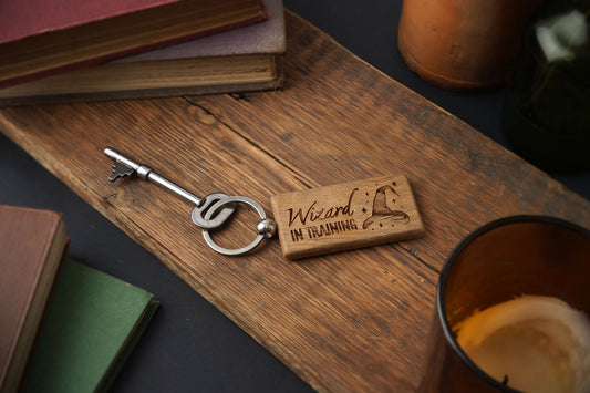 Personalised Rectangular Oak Keyring 'Wizard In Training' With Witch's Hat Illustration