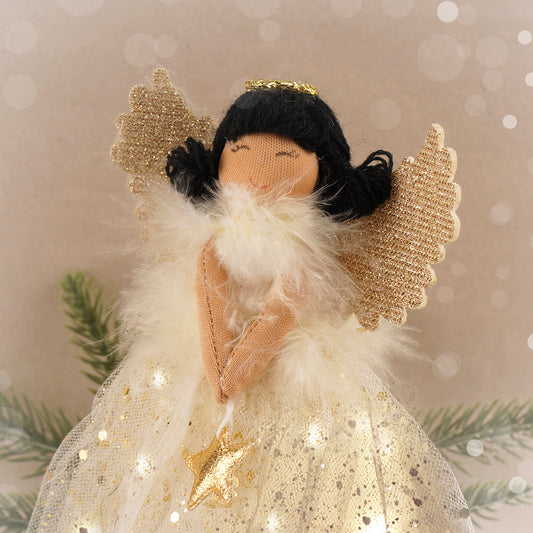 Gold Dark Haired Light Up Tree Topper Angel Decoration | Battery Powered | Size: 18cm | Christmas | Gift For Home