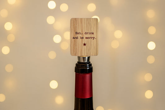 Rectangular Oak Wine Bottle Stopper | 'Eat Drink and Be Merry' | Funny Festive Drink Accessory | Christmas Bar Accessory