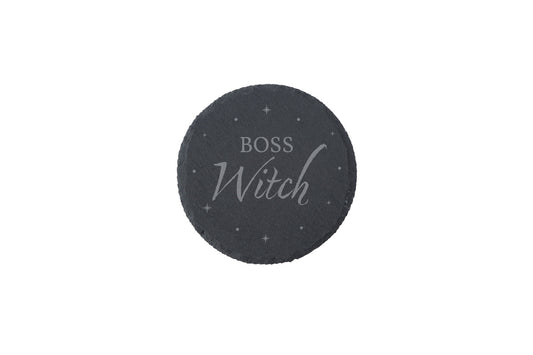 Set of 4 | Halloween 'Boss Witch' Round Slate Coaster in Gift Box