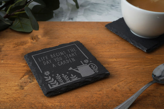 Square Slate Coaster - 'Life Begins The Day You...' Square Slate Coaster | Garden Coaster | Shed | Home Decor