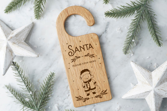 Little Bear Co. - 'Bear - Santa Please Stop Here' Oak Door Hanger | Perfect Gift | Mother's Day | Novelty