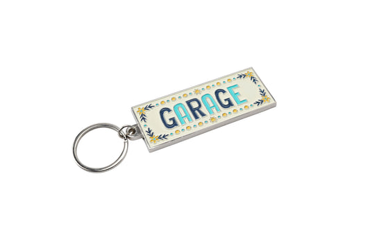 Live Happy 'Garage' Enamel Keyring | White Blue | Bag Charm | Keychain | Gift For All