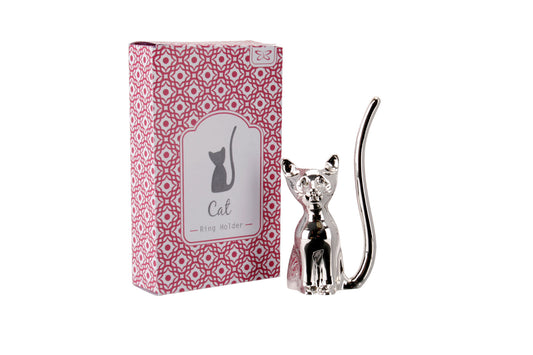 Cat Metal Silver Finish Ring and Jewellery Holder and Organiser Stand and Crystal Eyes | Bedside and Bathroom or Kitchen Sink Storage