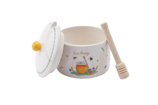 Ceramic 'Bee Happy' Honey Pot and Drizzler in Gift box