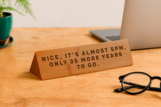 Wooden Desk Sign 'Nice, It's Almost 5pm. Only 35 More Years To Go' | Gift For Her | Gift For Him | Office Sign | Engraved Gift
