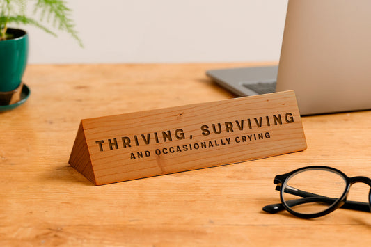 Wooden Desk Sign 'Thriving, Surviving and Occasionally Crying' | Gift For Her | Gift For Him | Office Sign | Engraved Gift