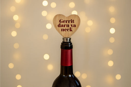 Heart Shaped Oak Wine Bottle Stopper | 'Gerrit Darn Ya Neck' | Bar Drink Accessory