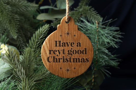Oak Hanging Bauble - 'Reyt Good Christmas' | Festive Decoration | Tree Hanger | Wall Hanger | Hanging Sign