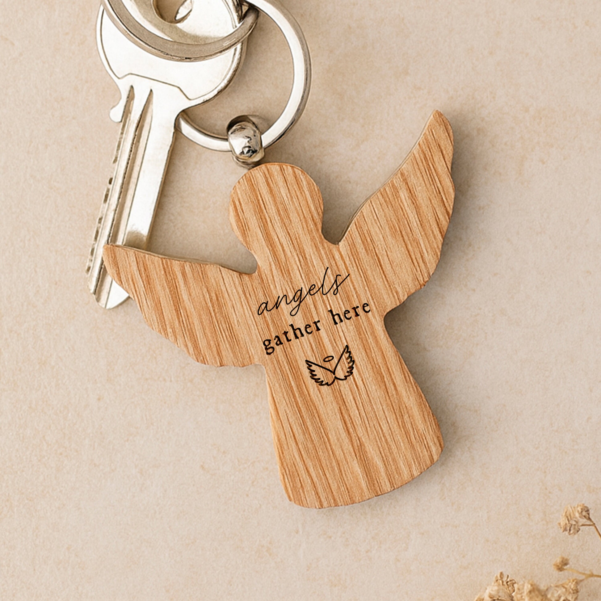 🎁 Elevate your everyday essentials with our angel oak wood keyring. Engraved with the words 'Angels gather here', with a pair of wings! This keyring is more than just a functional accessory—it's a beautiful sentimental way to keep your keys together in one place