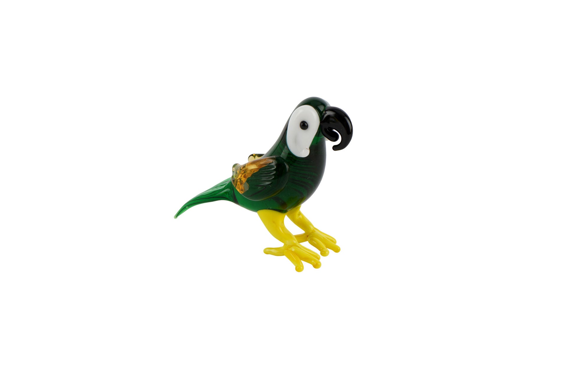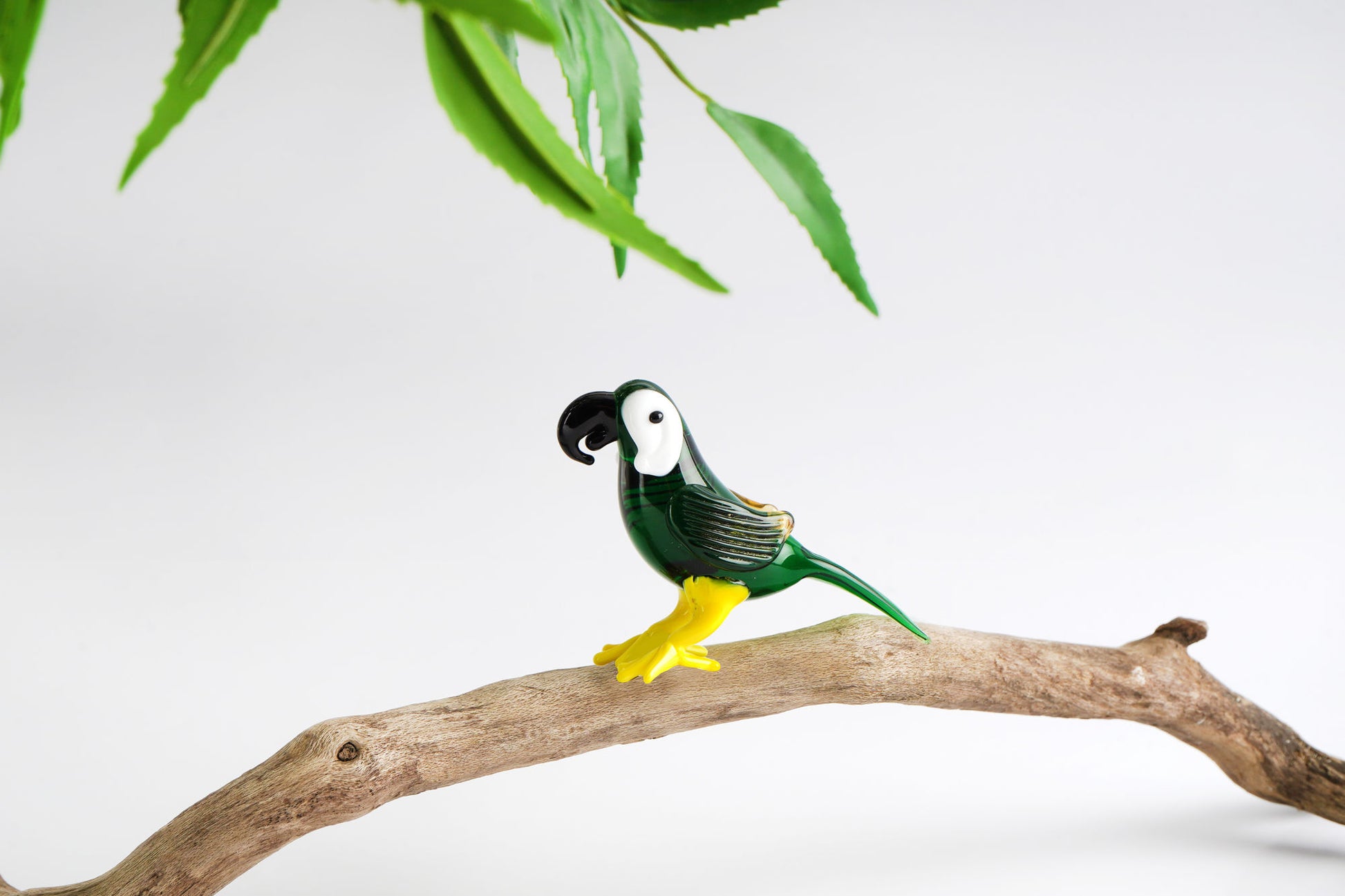 π Perched gracefully, the parrot is sculpted from polished glass with vibrant detailing, featuring a bold body, delicate wings, and striking yellow feet that add a unique finishing touch.