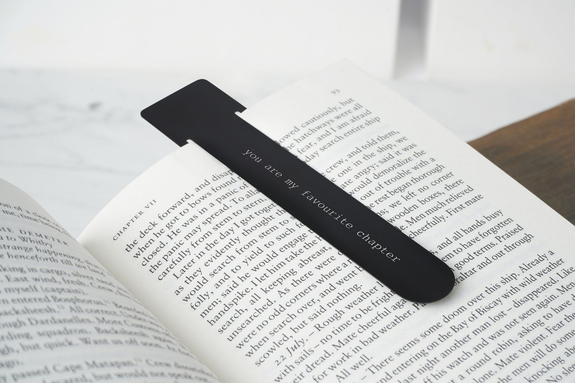 🎁 Add a touch of elegance and meaning to your reading time with this sleek black metal bookmark, engraved with the romantic phrase: "You Are My Favourite Chapter."