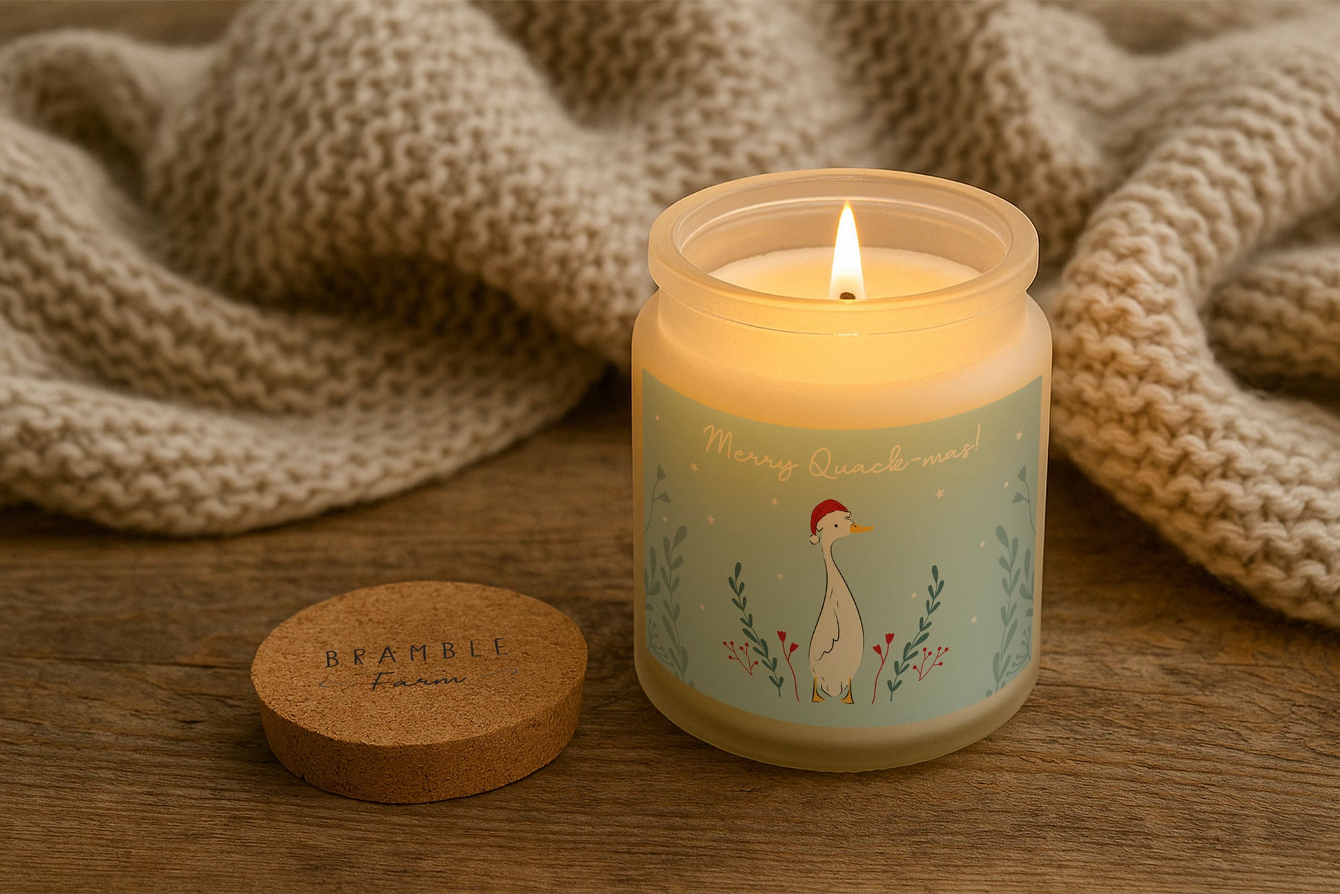 🕯️ Candle Size: 9.2cm (H) x 7cm (W) - frosted glass jar decorated with a charming duck “Merry Quack-mas!” illustration, bringing a warm countryside feel to seasonal décor.