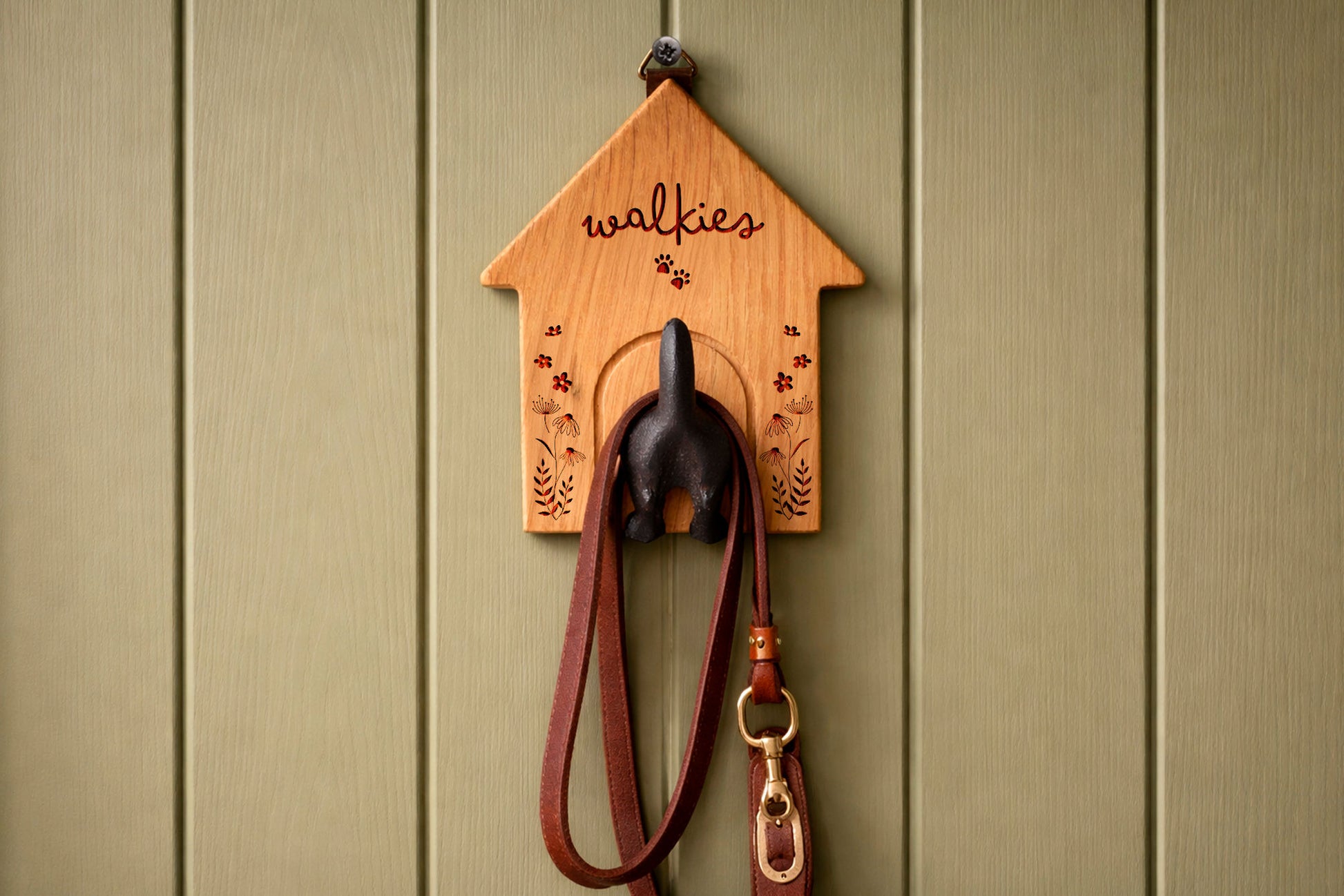 ๐ Make walk time a little more joyful with this charming Walkies wall-mounted dog lead hook. Featuring a solid oak backing engraved with floral details and paw prints, paired with a playful cast iron dog bum hook, this piece is both practical and full of character.