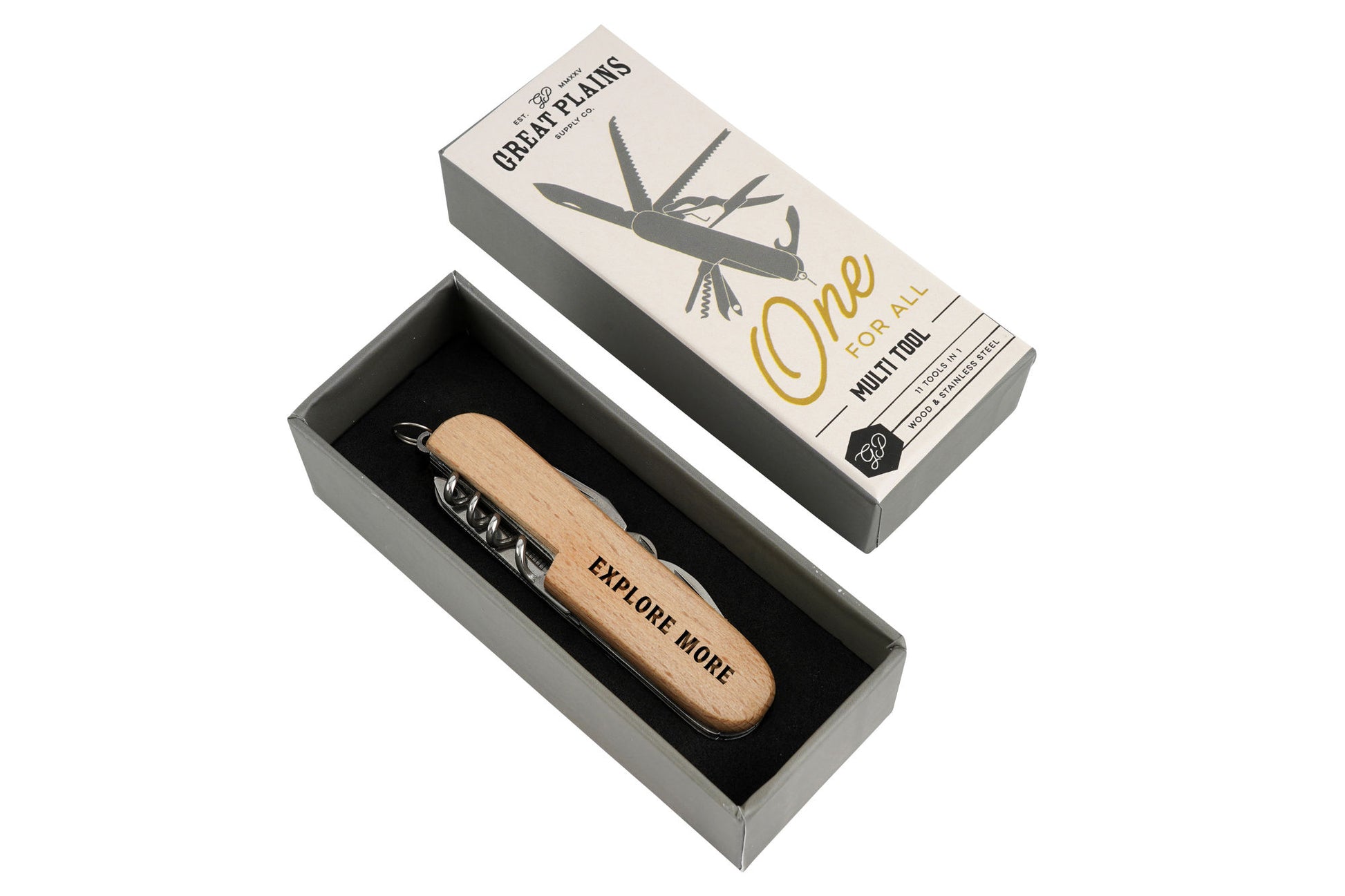 🎁 Be ready for anything with this stylish and practical 11-in-1 wooden multi-tool, engraved with the inspiring slogan "Explore More."